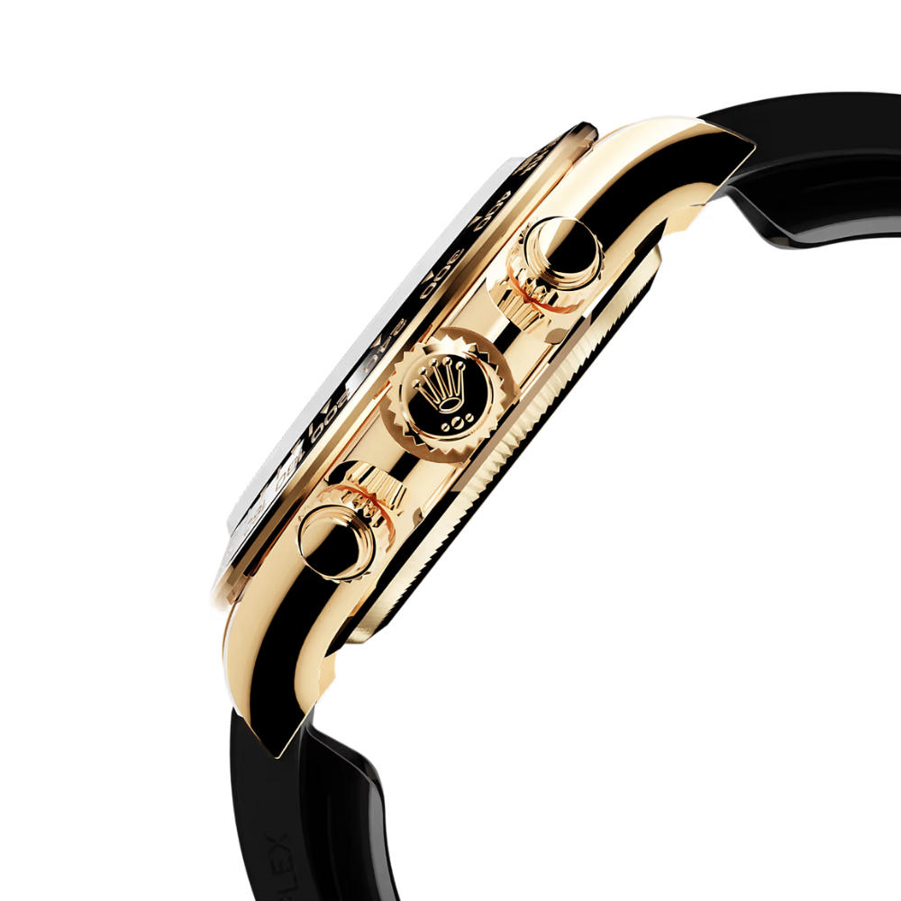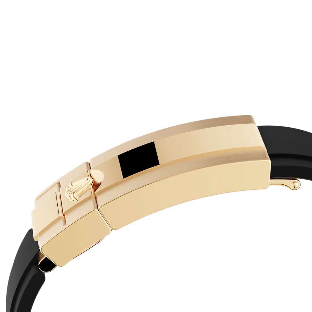 This reference blends the technical excellence of the Daytona line with a luxurious 18 ct yellow gold case and the sporty comfort of the Oysterflex strap. Its black and gold color scheme gives it a bold, elegant, and sporty character – suitable both for high-performance contexts and stylish wear.