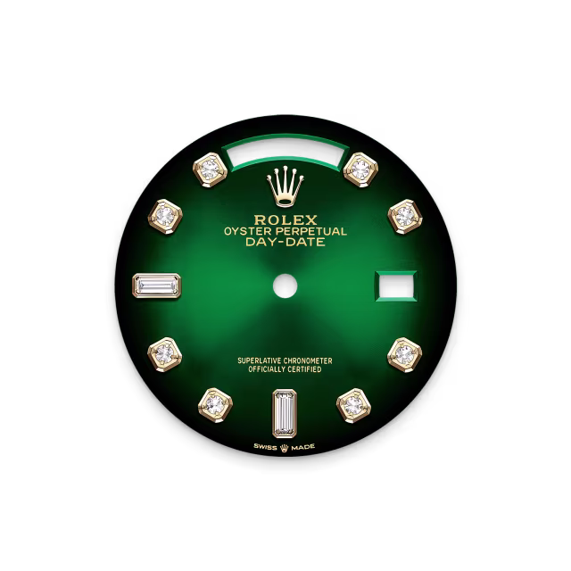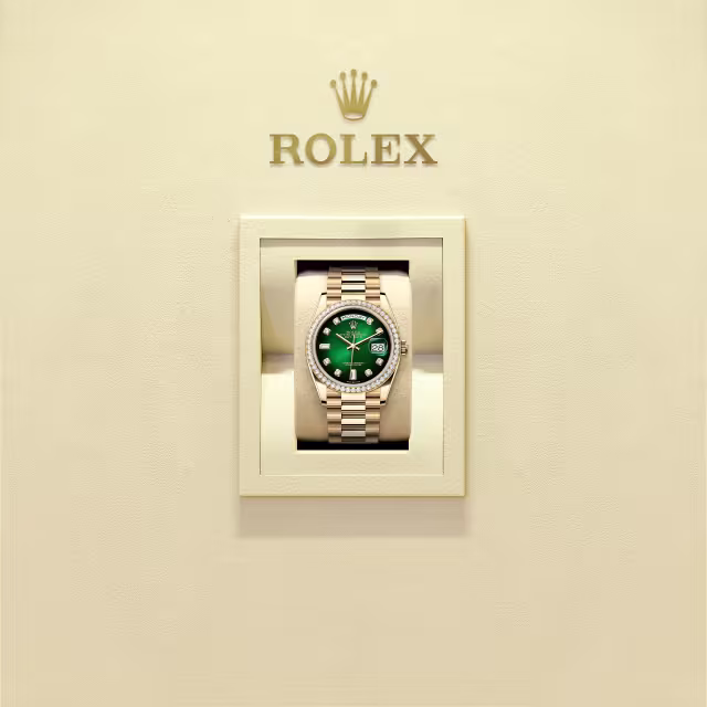 This Rolex Day-Date 36 is the epitome of elegance and prestige. Crafted in 18 ct yellow gold, it features a rare Green Aventurine dial, a diamond-set bezel, and diamond hour markers, offering a refined and luxurious look.