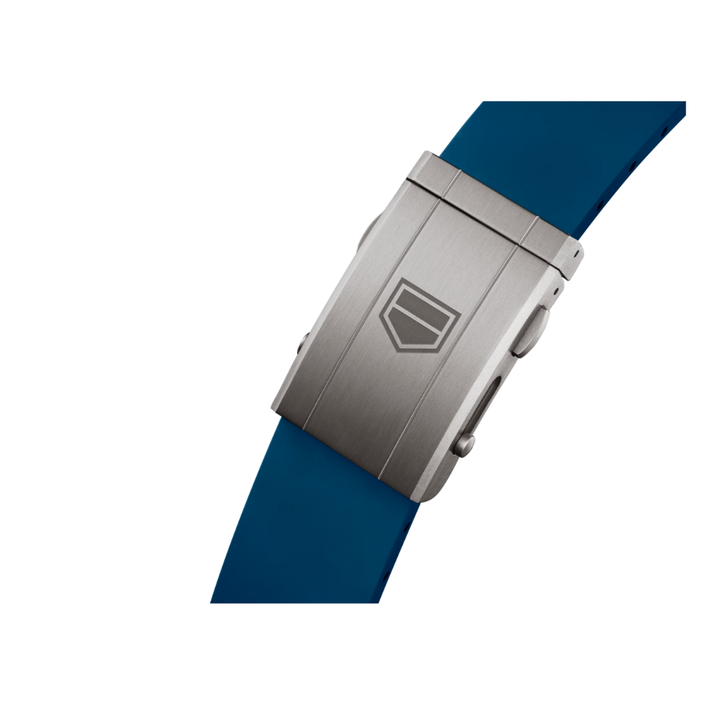 Completing the design is a sporty blue rubber strap with an integrated design, engineered to provide maximum comfort and durability. The strap secures with a titanium folding clasp that matches the case material, ensuring a secure fit and adding to the overall lightweight feel of the watch.
