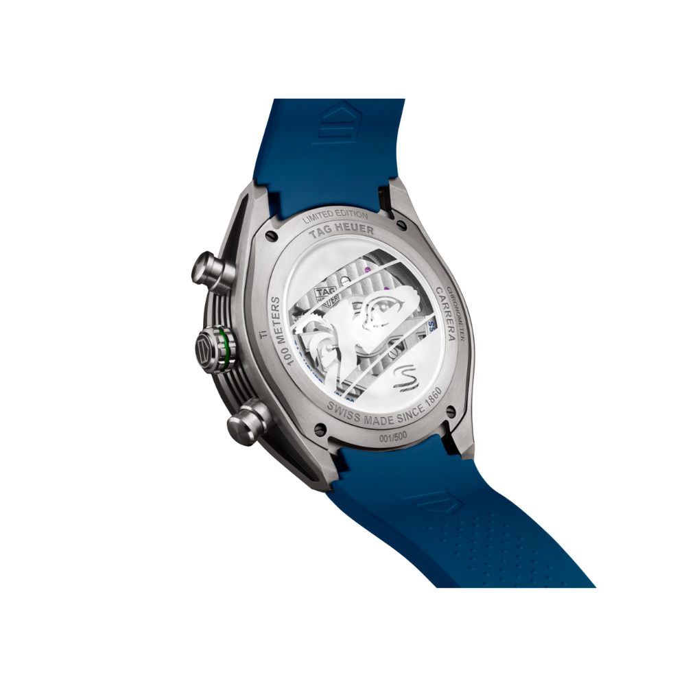 The TAG Heuer Carrera Chronograph Tourbillon x Senna CBU5081.FT6274 stands as a stunning tribute to the legendary Formula 1 icon Ayrton Senna, encapsulating the spirit of racing excellence and pioneering watchmaking innovation. Limited to only 250 pieces worldwide, this exceptional timepiece blends the precision engineering of TAG Heuer’s in-house Calibre TH20-09 with a bold and modern design inspired by Senna’s remarkable motorsport legacy. Crafted with a lightweight 44mm grade 2 titanium case, a skeletonized dial featuring racing motifs, and the signature flying tourbillon at 6 o’clock, the watch offers both outstanding technical performance and a visually striking presence on the wrist.